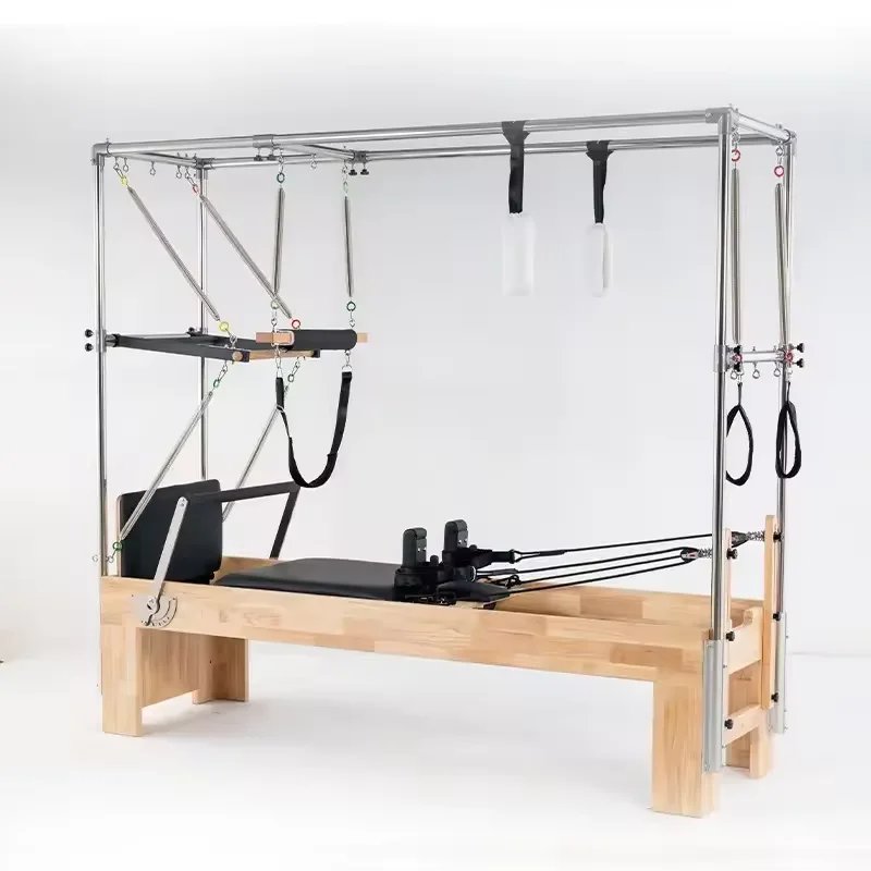 Professional oak wood Pilates equipment combining reformer and Cadillac bed. Ideal for balanced yoga and fitness training. Studio-quality design from 10+ years experienced manufacturer.